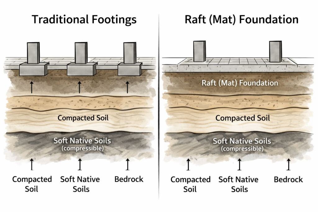 comparison of traditional footings and raft (mat) foundation systems – interpretive engineering illustration