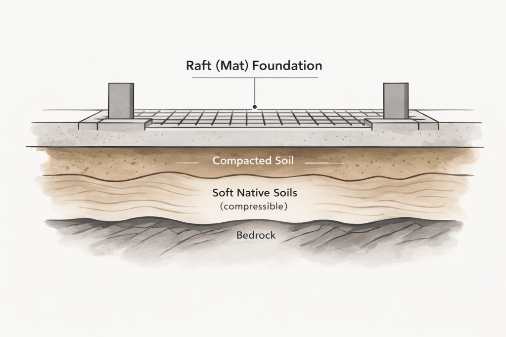 Because soils in this area are soft and compressible, one approach often considered is a raft (mat) foundation. With bedrock roughly 40 feet below grade, driving piles to rock would be structurally reliable but potentially expensive. A raft system instead spreads the building’s weight across a large reinforced concrete slab covering most of the footprint.